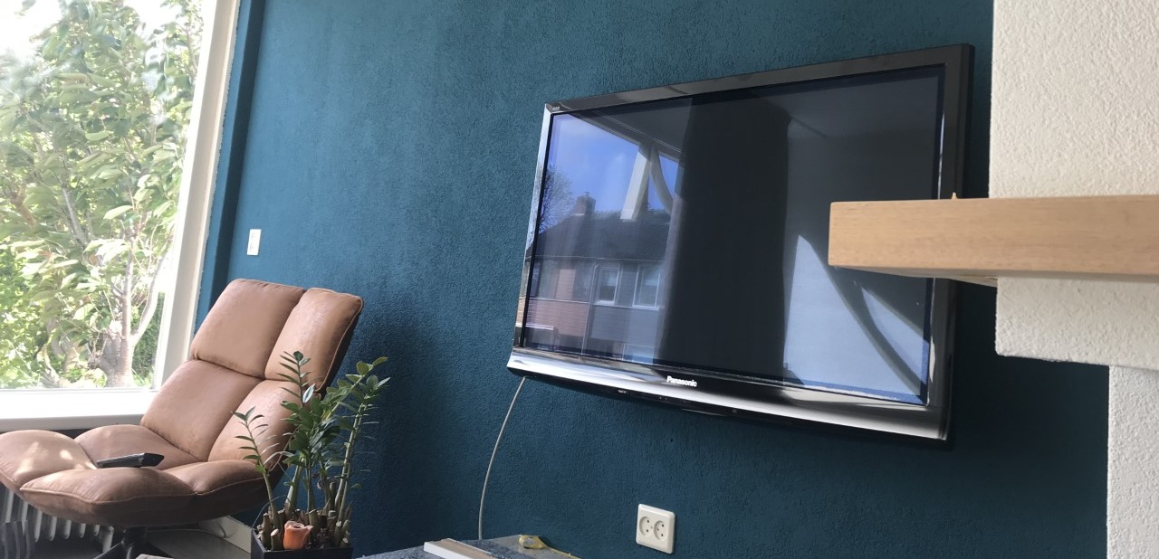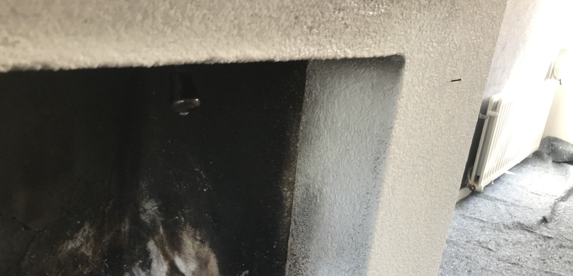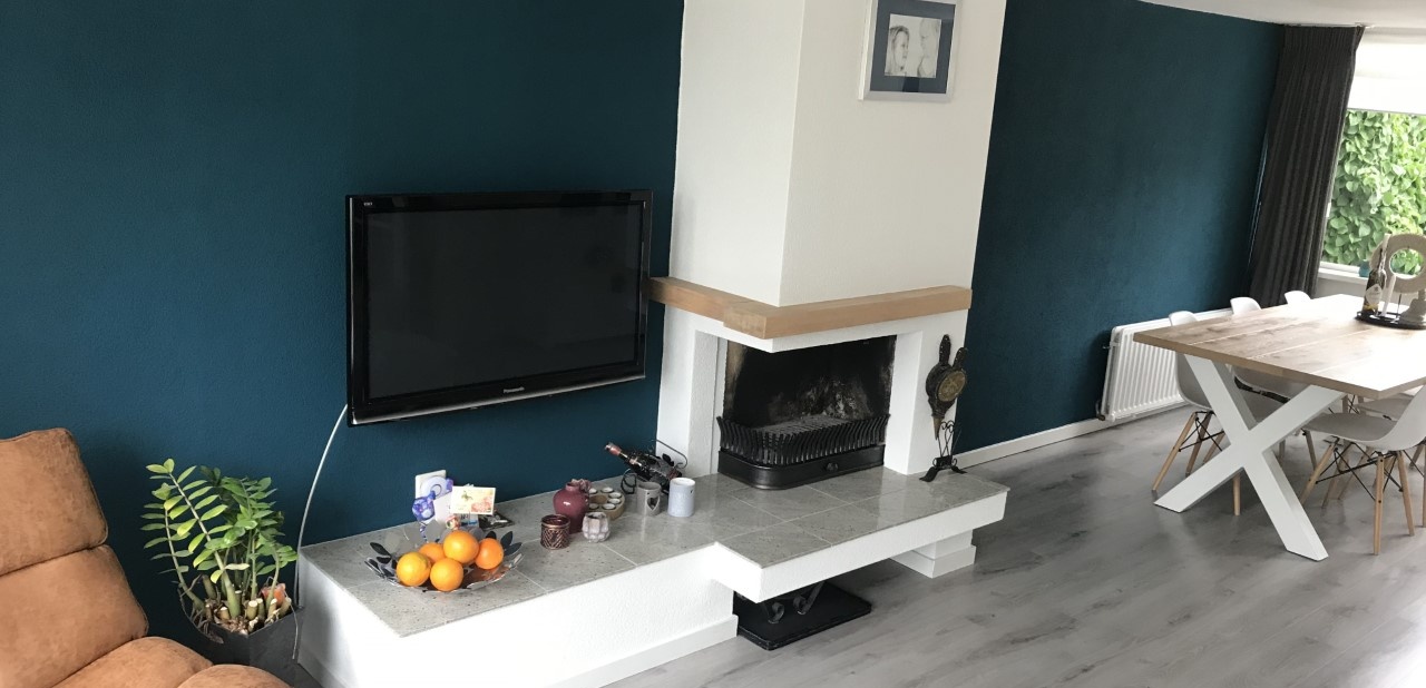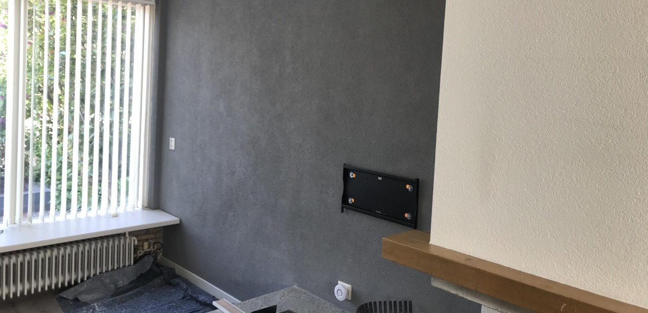 Alle wanden woonkamer gesausd. Wand openhaard geïsoleerd en geschilderd.