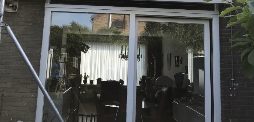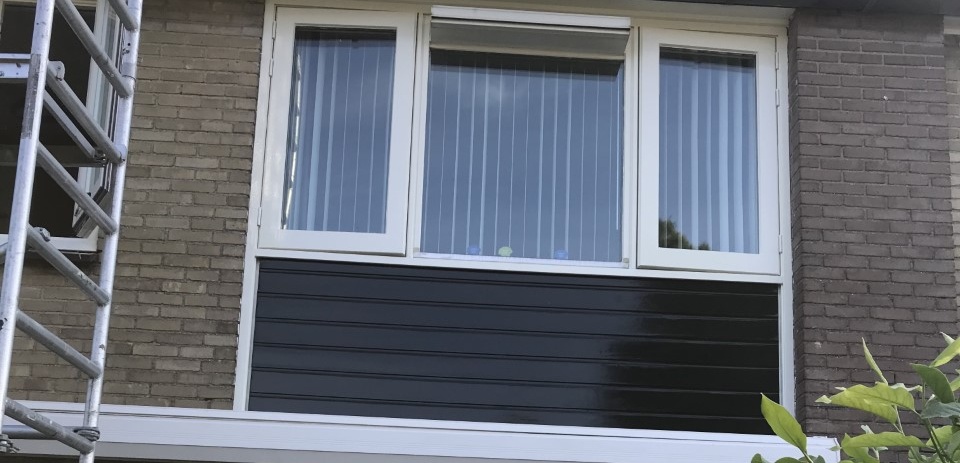 Kozijnen gegrond en 2 x afgelakt. Rabatdelen gegrond en 2 x afgelakt. 2 onderdorpels met houtrot zelf verwijderd en nieuwe laten plaatsen. Onderdorpels gegrond en 2 x afgelakt.