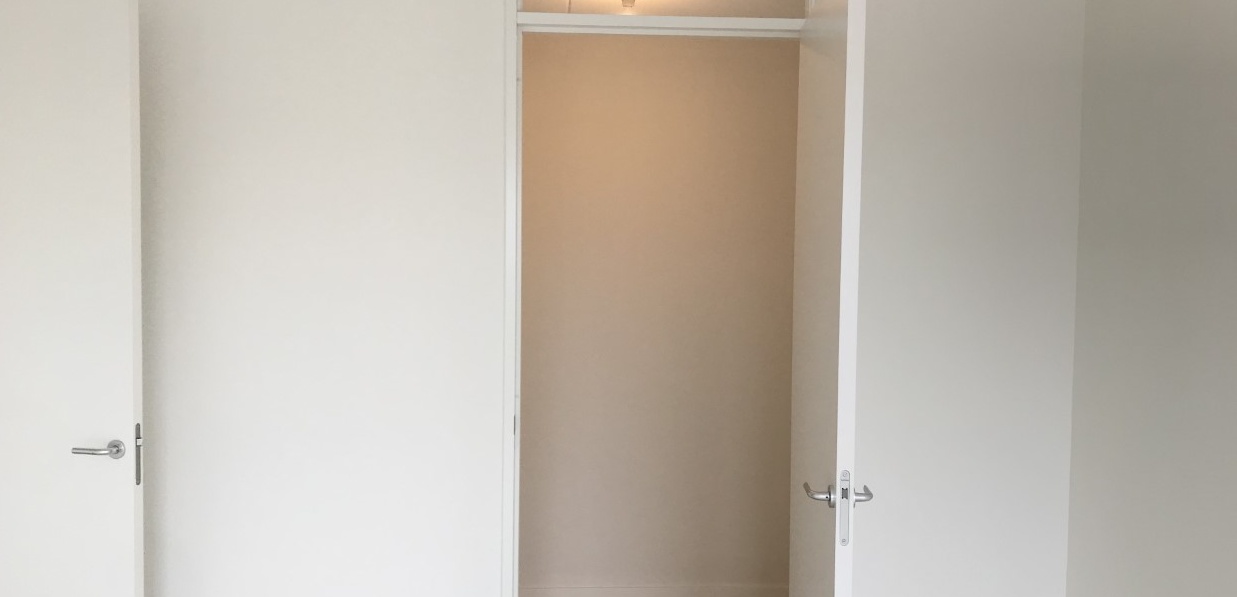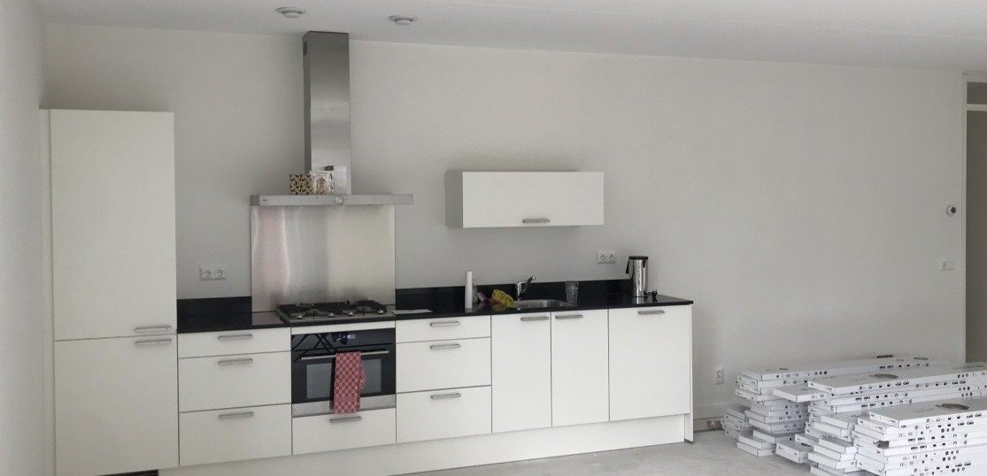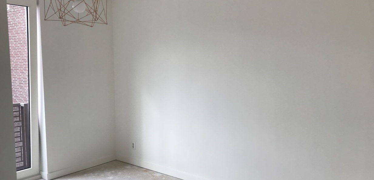 Alle wanden in een nieuwbouw appartement eerst met primer behandeld, daarna gesausd met Latex kleur 9010.