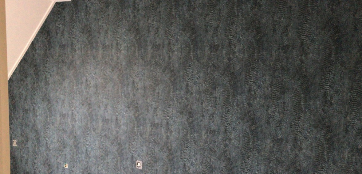 Het plafond in het dakkapel van de masterbedroom van gipsplaten voorzien, zodat het plafond glad gestuct kon worden. Daarna de muren geschilderd en een muur behangen.