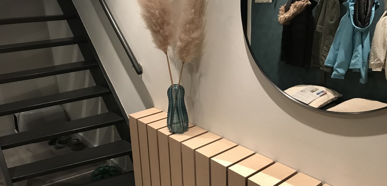 Kapstok in de hal verwijderd. Hal behangen. Zijwand meterkast vervangen. Meterkast en voorraadkast geschilderd. Bankje gemaakt. Verwarmingsombouw gemaakt. Trap geschilderd.