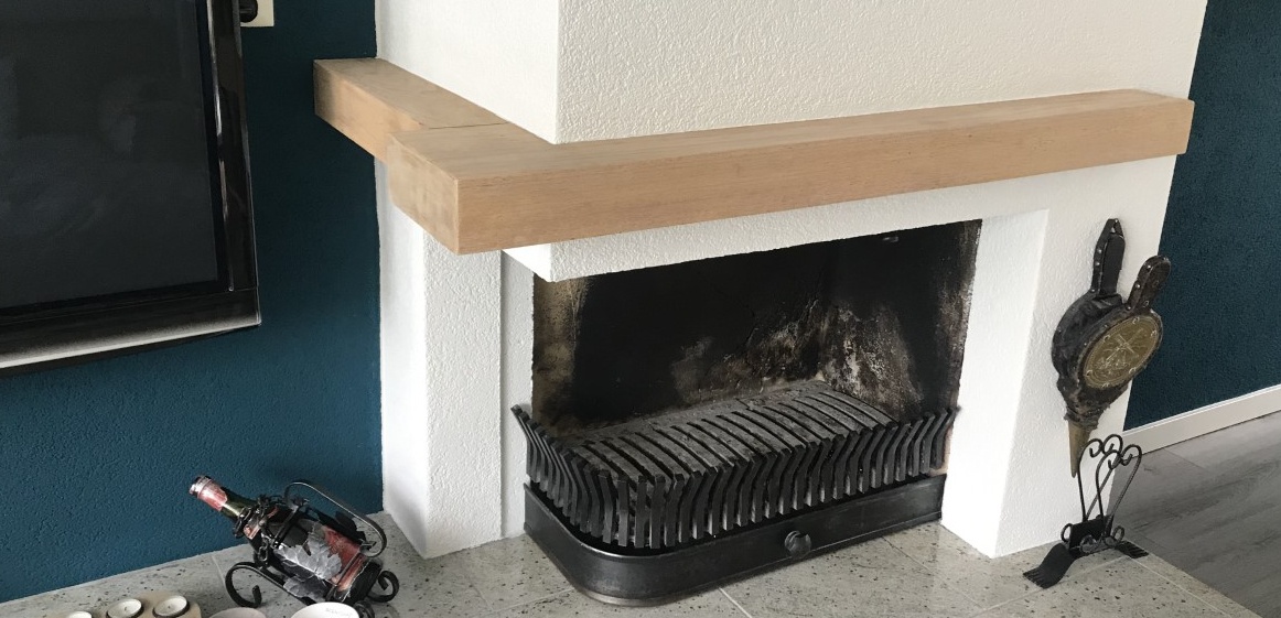 Alle wanden woonkamer gesausd. Wand openhaard geïsoleerd en geschilderd.